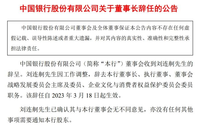 中國(guó)銀行:劉連舸辭去董事長(zhǎng)等職務(wù)