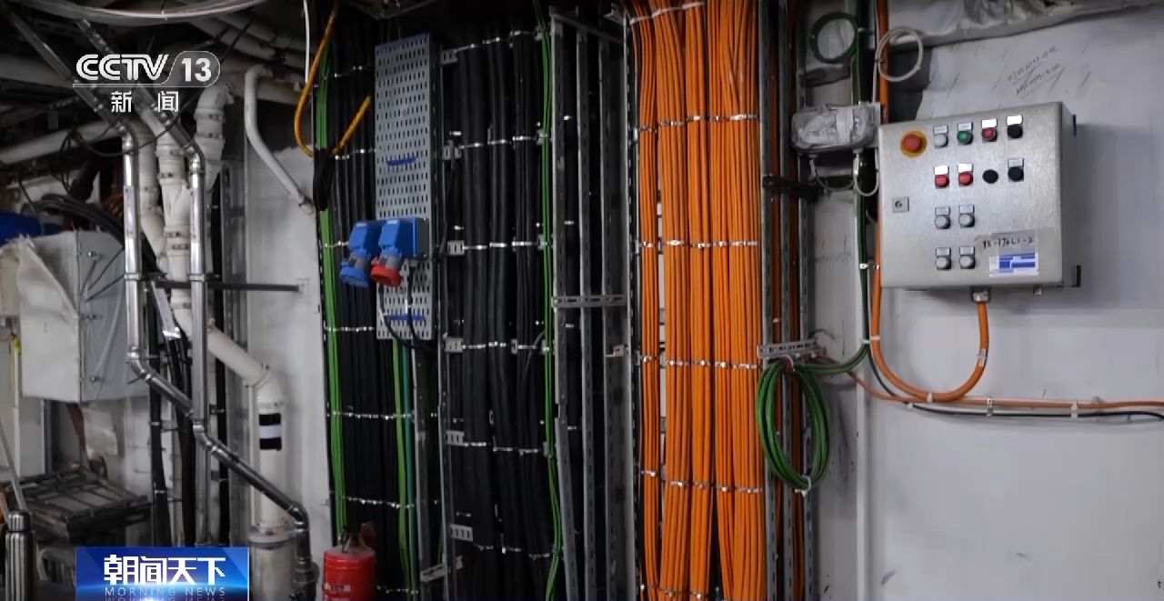 總臺央視記者 李寧:如何確保這樣一艘海上巨無霸的正常運行,靠的就是我身后的這些電纜,這些電纜就好比這艘船上的神經(jīng)和血管,它的總長度超過4300公里,比哈爾濱到三亞的距離還要遠(yuǎn)。