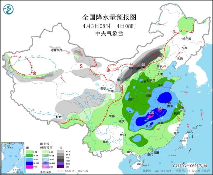 4月3日08時至4日08時,新疆南疆盆地和東部、西藏東部、西北地區(qū)中部和東北部、內蒙古中部、川西高原北部、陜西北部、山西北部、河北北部等地部分地區(qū)有小到中雪或雨夾雪,其中,內蒙古中部、河北西北部等地部分地區(qū)有大到暴雪,局地大暴雪(20~22毫米)。湖北東部和南部、湖南北部、江西北部、安徽、河南東部、山東南部、江蘇及陜西中部、山西中部、重慶北部、廣西東北部等地有大到暴雨,其中,安徽西南部、湖北東部、湖南北部等地部分地區(qū)有大暴雨(100~130毫米)。內蒙古、東北地區(qū)西部、新疆南部、華北、黃淮、江淮等地部分地區(qū)有4~6級風,局部有6~7級風(見圖3)。渤海、黃海西南部、東海西北部、長江口附近海域將有8級、陣風9級的大風,其中渤海灣將有9級、陣風10級的大風。