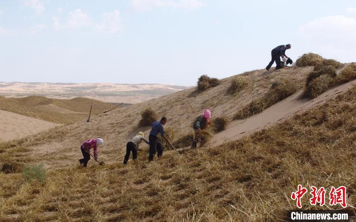 白芨灘林場員工扎麥草方格進行治沙(資料圖)?!幭撵`武白芨灘國家級自然保護區(qū)管理局供圖