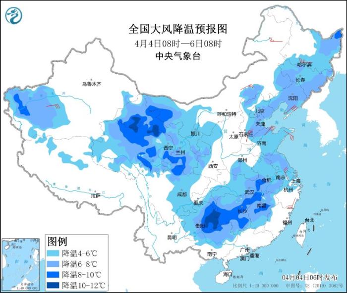 圖2 全國大風降溫預報圖(4月4日08時至6日08時)