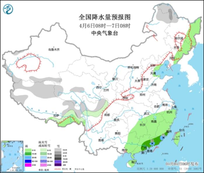 4月6日08時至7日08時,內蒙古東北部、黑龍江西北部、新疆南疆盆地和南疆西部山區(qū)、西藏北部和東部、青海南部、川西高原北部等地部分地區(qū)有小雪或雨夾雪,局地有中雪。東北地區(qū)東部、西藏東南部、河北東北部、天津東部、江南中東部、華南大部、臺灣島等地部分地區(qū)有小到中雨,其中,福建東南部、廣東東南部等地局地有大雨(25~45毫米)。內蒙古東北部和中部、吉林中部等地部分地區(qū)有4~6級風(見圖5)。渤海、渤海海峽、黃海北部海域將有6~7級、陣風8級的偏北風。
