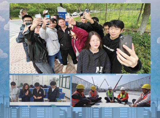 95后汪澤偉(上圖中間黑色衣服,左下圖右二)和00后王檜耀(右下圖右二)“身份互換”后的場景。中鐵四局、安徽建筑大學(xué)供圖