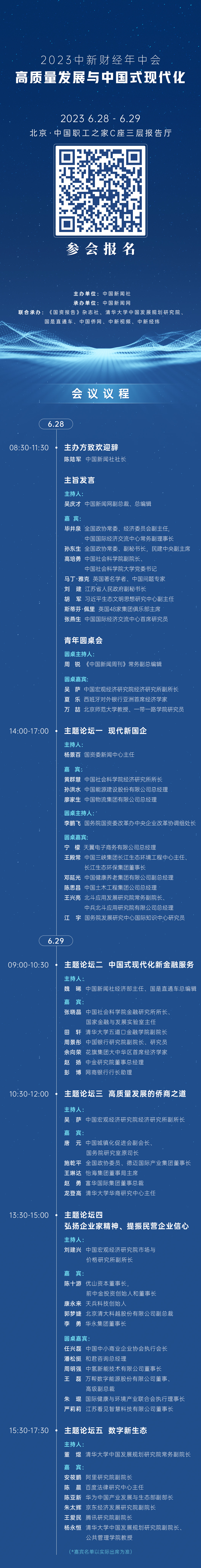 為宣傳貫徹落實(shí)黨的二十大精神和部署,以高質(zhì)量發(fā)展扎實(shí)推進(jìn)中國(guó)式現(xiàn)代化建設(shè),推動(dòng)全面建設(shè)社會(huì)主義現(xiàn)代化國(guó)家開(kāi)好局起好步,中國(guó)新聞社擬于2023年6月28至29日在北京舉辦“2023中新財(cái)經(jīng)年中會(huì)”,主題為“高質(zhì)量發(fā)展與中國(guó)式現(xiàn)代化”。