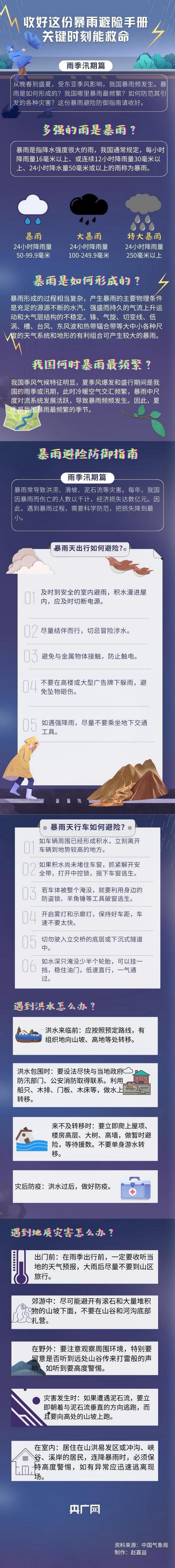 央廣網(wǎng)長春7月5日消息(記者郭東隅)正值汛期,我國多地遭遇今年以來最強(qiáng)降雨過程,出現(xiàn)暴雨、大暴雨甚至特大暴雨。那么,暴雨究竟是如何形成的?如何防范其引發(fā)的各種災(zāi)害?這份暴雨避險防御指南請收好,關(guān)鍵時刻能救命。