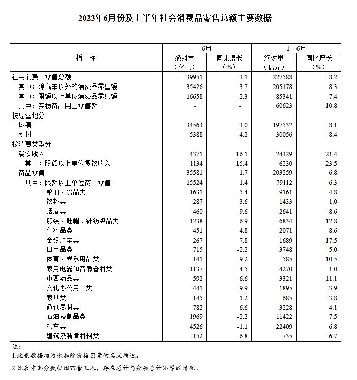6月份,社會消費品零售總額39951億元,同比增長3.1%。