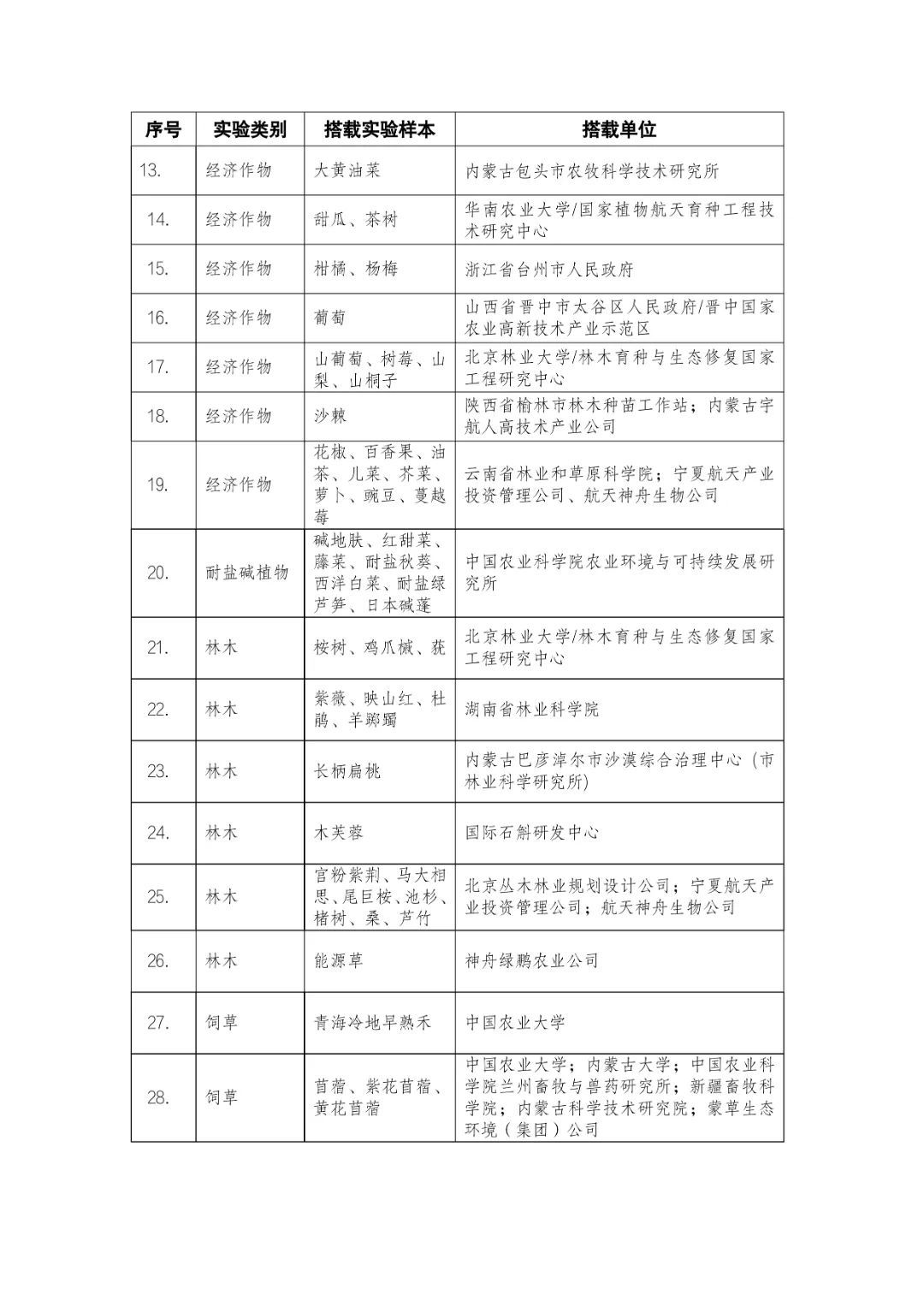 載人航天工程立項實施以來,始終注重提升工程綜合效益,致力服務(wù)國家經(jīng)濟社會發(fā)展。在工程歷次飛行任務(wù)中,均安排了航天育種搭載實驗項目。從神舟十六號載人飛船開始,中國載人航天工程辦公室向社會公開征集航天育種搭載實驗項目,于3月23日在工程官網(wǎng)發(fā)布《關(guān)于征集神舟系列載人飛船航天育種實驗項目的機會公告》,同時在工程官網(wǎng)開辟“航天育種搭載實驗”管理平臺,接受搭載需求單位申報實驗項目。辦公室組織專家對申報項目進行評審,遴選出53個單位的136種份航天育種實驗材料實施搭載。包括農(nóng)作物47份(糧食作物種子12份、經(jīng)濟作物種子28份、耐鹽堿植物7份);林草、花卉和藥用植物76份(林木17份、飼草21份、花卉7份、藥用植物31份);微生物和其它13種(農(nóng)業(yè)微生物菌種2種、工業(yè)微生物菌種3種、食用菌3種、藻類和苔蘚5種)(清單附后)。