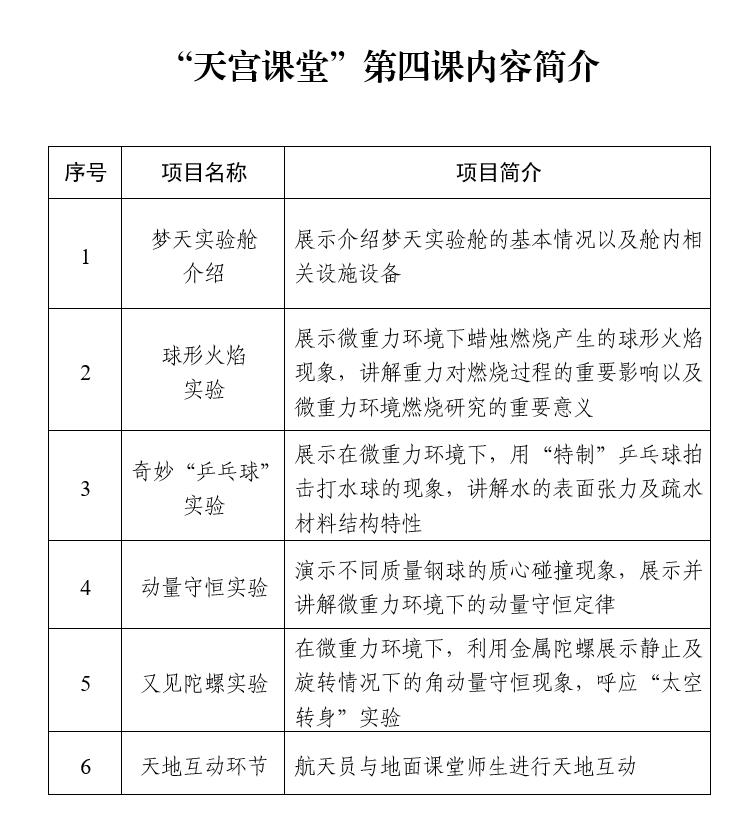 本次太空授課活動繼續(xù)采取天地互動方式進行。3名航天員將在軌展示介紹中國空間站夢天實驗艙工作生活場景,演示球形火焰實驗、奇妙“乒乓球”實驗、動量守恒實驗以及又見陀螺實驗,并與地面課堂進行互動交流。