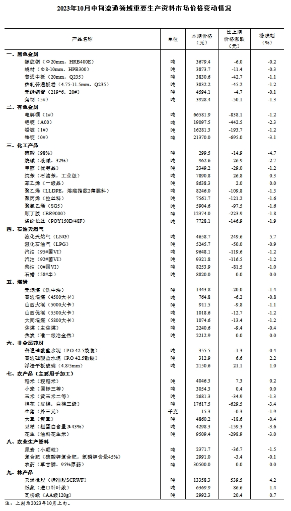 中新網(wǎng)10月24日電 國家統(tǒng)計局網(wǎng)站發(fā)布2023年10月中旬流通領(lǐng)域重要生產(chǎn)資料市場價格變動情況。2023年10月中旬與10月上旬相比,8種產(chǎn)品價格上漲,37種下降,5種持平。其中液化天然氣(LNG)價格環(huán)比漲5.7%,天然橡膠(標準膠SCRWF)價格環(huán)比漲4.2%,棉花價格環(huán)比跌3.4%,生豬(外三元)價格環(huán)比跌1.9%。(中新財經(jīng))