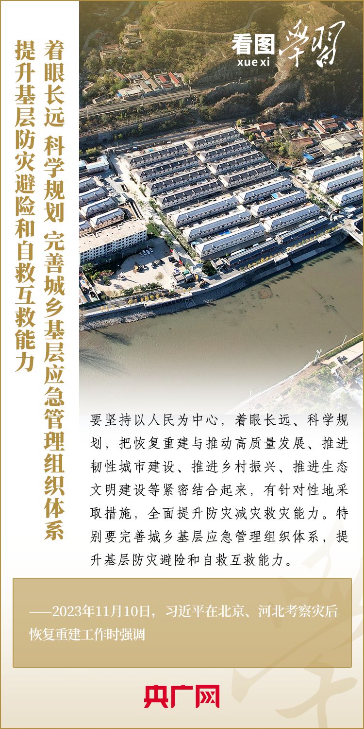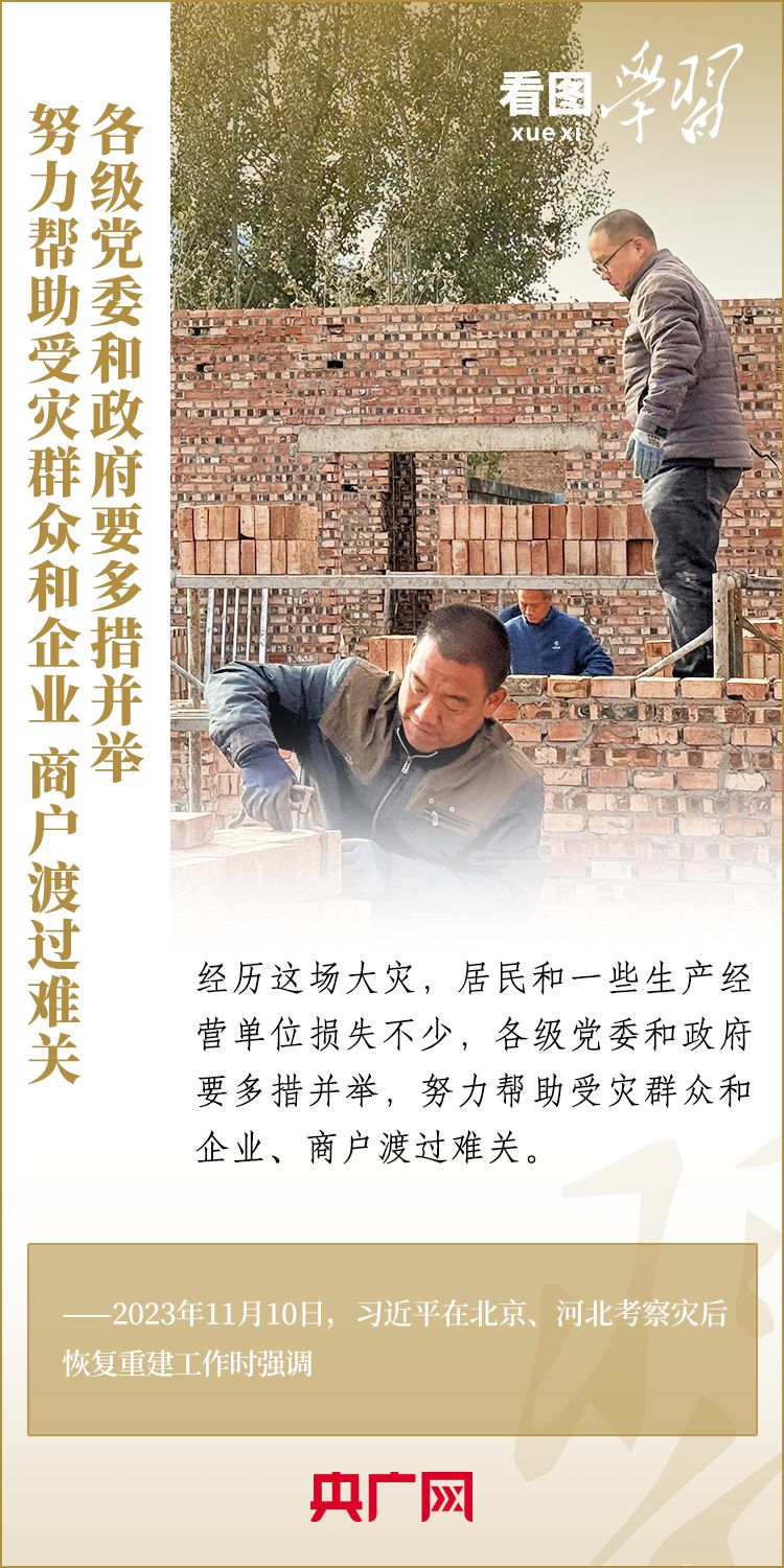 11月10日,習(xí)近平總書記在北京、河北考察災(zāi)后恢復(fù)重建工作??倳浬钊雽W(xué)校、社區(qū)、村莊、水利工程工地,實地察看村容村貌,了解基礎(chǔ)設(shè)施恢復(fù)建設(shè)提升等情況,要求有關(guān)部門堅持以人民為中心,堅持系統(tǒng)觀念,著眼長遠(yuǎn)、科學(xué)規(guī)劃,把恢復(fù)重建與推動高質(zhì)量發(fā)展、推進(jìn)韌性城市建設(shè)、推進(jìn)鄉(xiāng)村振興、推進(jìn)生態(tài)文明建設(shè)等緊密結(jié)合起來,有針對性地采取措施,再接再厲抓好災(zāi)后恢復(fù)重建,確保廣大人民群眾安居樂業(yè)、溫暖過冬。