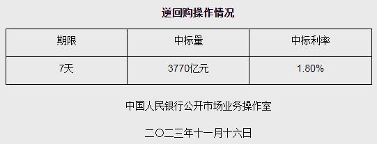 中新網11月16日電 據央行網站消息,為維護銀行體系流動性合理充裕,2023年11月16日人民銀行以利率招標方式開展了3770億元逆回購操作,中標利率1.80%,期限為7天。具體情況如下:
