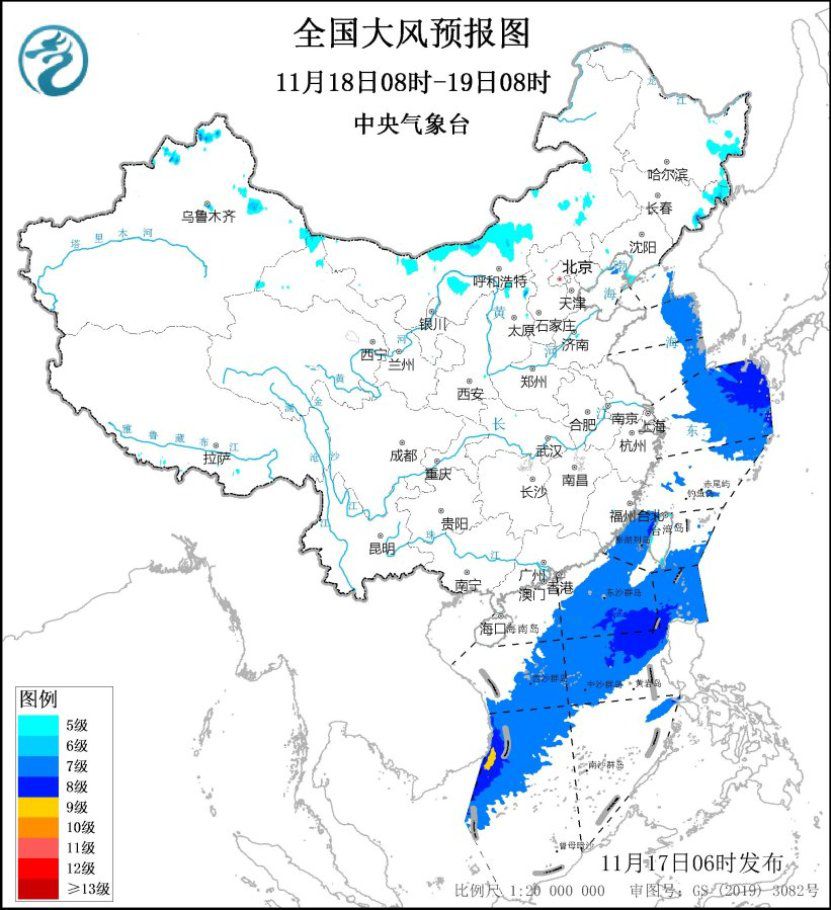 11月17日08時(shí)至18日08時(shí),內(nèi)蒙古中東部、東北大部、河北北部、山東半島東部等地將有5~6級(jí)、陣風(fēng)7~8級(jí)的大風(fēng);渤海、渤海海峽、黃海大部海域、東海大部海域、臺(tái)灣海峽、臺(tái)灣以東洋面、巴士海峽、南海大部海域?qū)⒂?~8級(jí)、陣風(fēng)9~10級(jí)的大風(fēng)。11月18日08時(shí)至19日08時(shí),內(nèi)蒙古中東部、黑龍江東部、吉林東部等地將有5~6級(jí)、陣風(fēng)7~8級(jí)的大風(fēng);黃海東部海域、東海東北部海域、臺(tái)灣海峽、臺(tái)灣以東洋面偏南海域、巴士海峽、南海大部海域?qū)⒂?~8級(jí)、陣風(fēng)9~10級(jí)的大風(fēng)。中央氣象臺(tái)11月17日06時(shí)繼續(xù)發(fā)布大風(fēng)藍(lán)色預(yù)警。