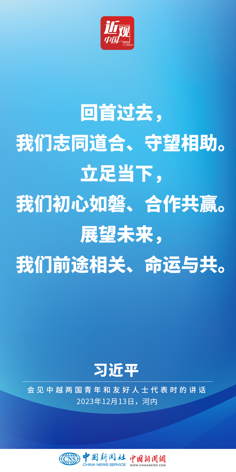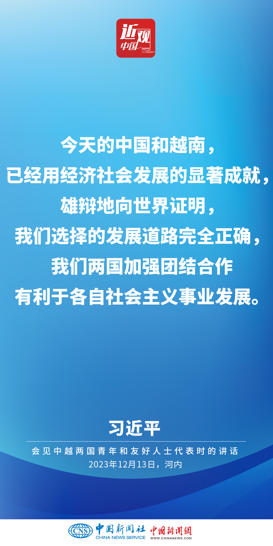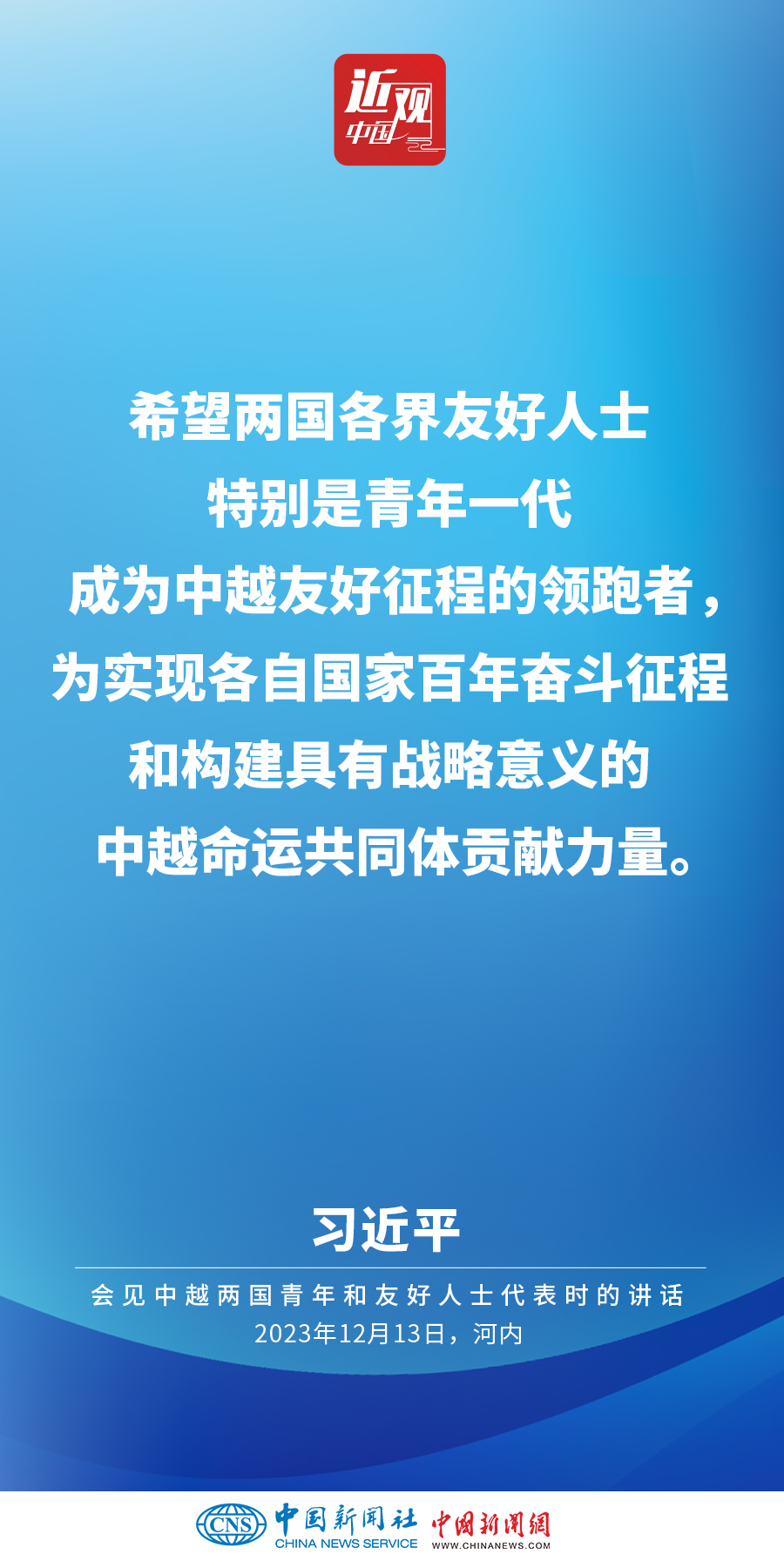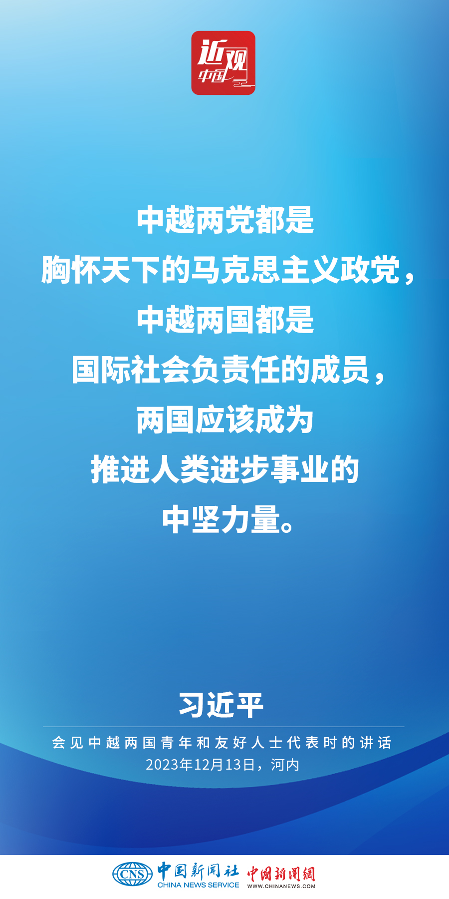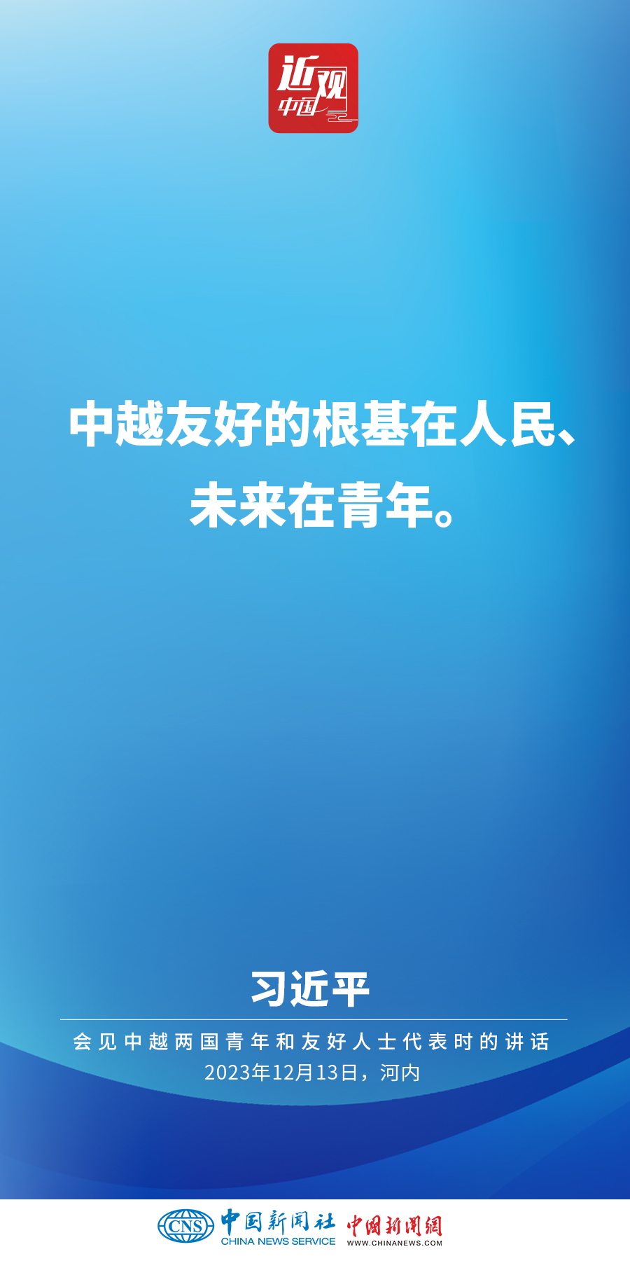 當(dāng)?shù)貢r(shí)間12月13日下午,中共中央總書記、國(guó)家主席習(xí)近平和夫人彭麗媛在河內(nèi)同越共中央總書記阮富仲夫婦共同會(huì)見(jiàn)中越兩國(guó)青年和友好人士代表。他在題為《賡續(xù)傳統(tǒng)友誼,開創(chuàng)中越命運(yùn)共同體建設(shè)新征程》的重要講話中指出,展望未來(lái),我們要始終不忘初心,牢記使命,攜手走好各自社會(huì)主義道路,讓工業(yè)化現(xiàn)代化建設(shè)成果更多惠及兩國(guó)人民,共同為人類進(jìn)步事業(yè)作出更大貢獻(xiàn)。