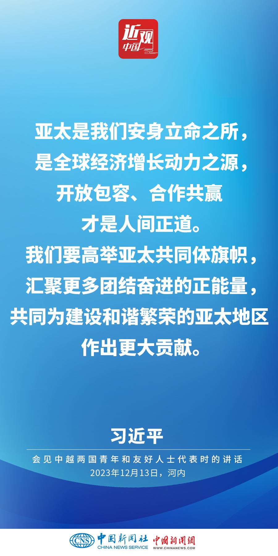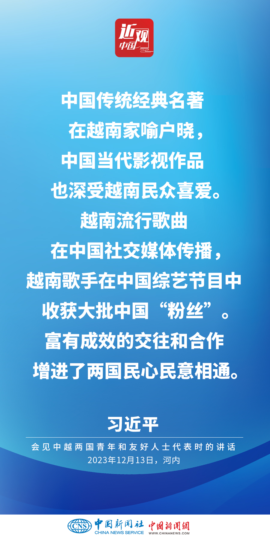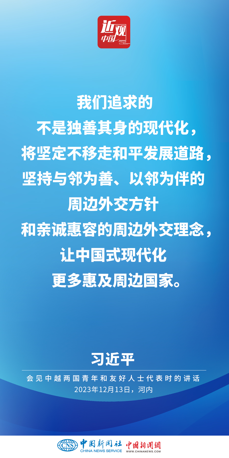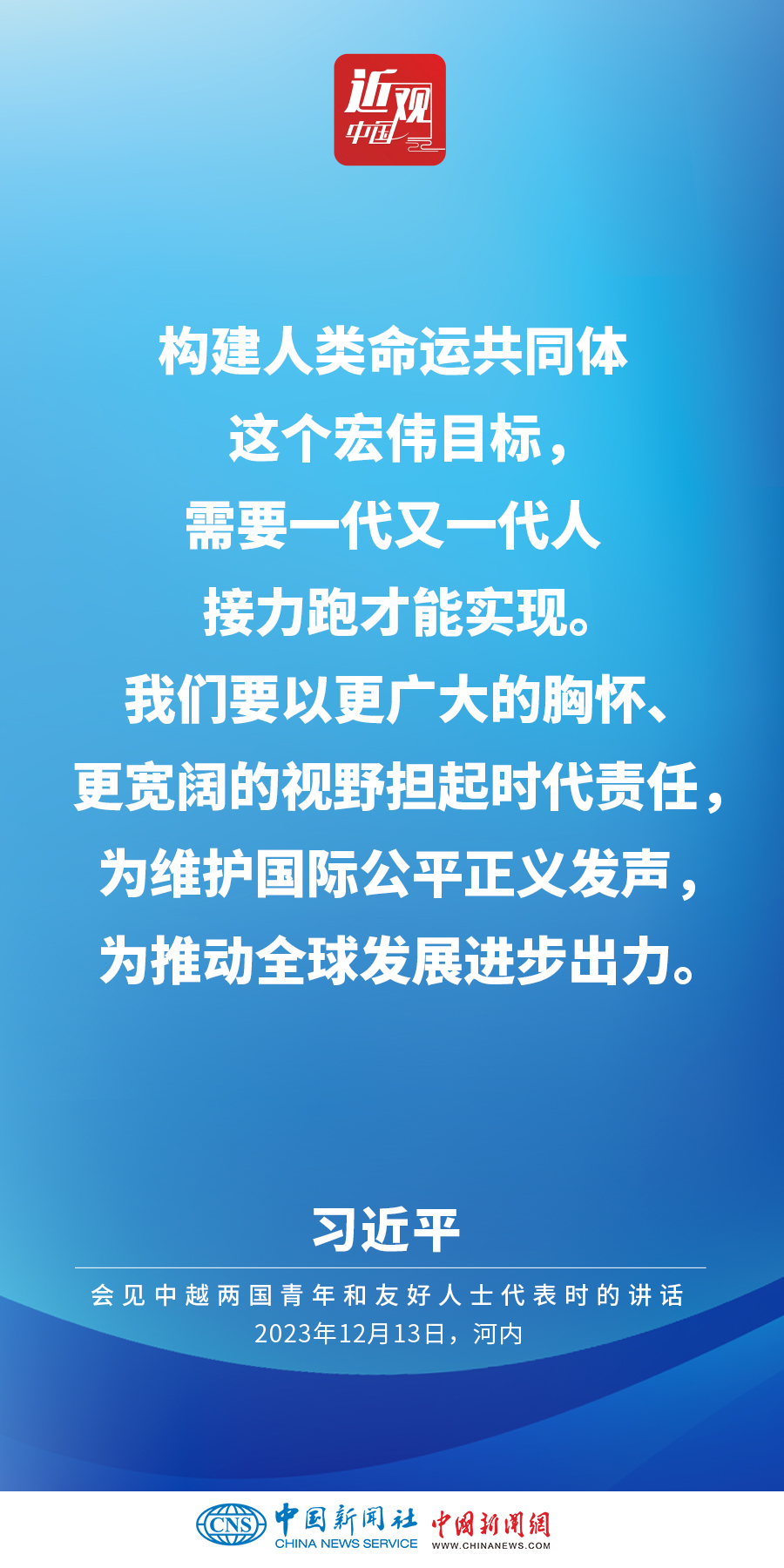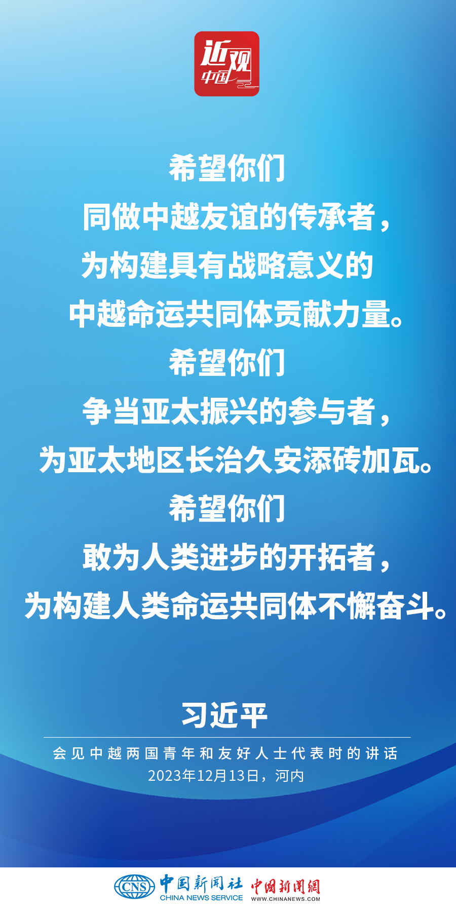 當(dāng)?shù)貢r(shí)間12月13日下午,中共中央總書記、國(guó)家主席習(xí)近平和夫人彭麗媛在河內(nèi)同越共中央總書記阮富仲夫婦共同會(huì)見(jiàn)中越兩國(guó)青年和友好人士代表。他在題為《賡續(xù)傳統(tǒng)友誼,開創(chuàng)中越命運(yùn)共同體建設(shè)新征程》的重要講話中指出,展望未來(lái),我們要始終不忘初心,牢記使命,攜手走好各自社會(huì)主義道路,讓工業(yè)化現(xiàn)代化建設(shè)成果更多惠及兩國(guó)人民,共同為人類進(jìn)步事業(yè)作出更大貢獻(xiàn)。