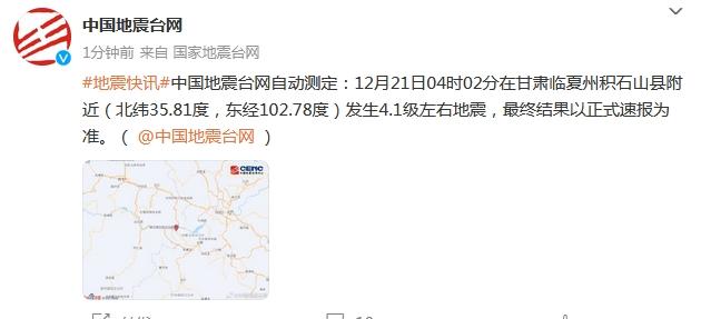 中新網12月21日電 據中國地震臺網中心官方微博消息,中國地震臺網自動測定:12月21日4時02分在甘肅臨夏州積石山縣附近(北緯35.81度,東經102.78度)發(fā)生4.1級左右地震,最終結果以正式速報為準。