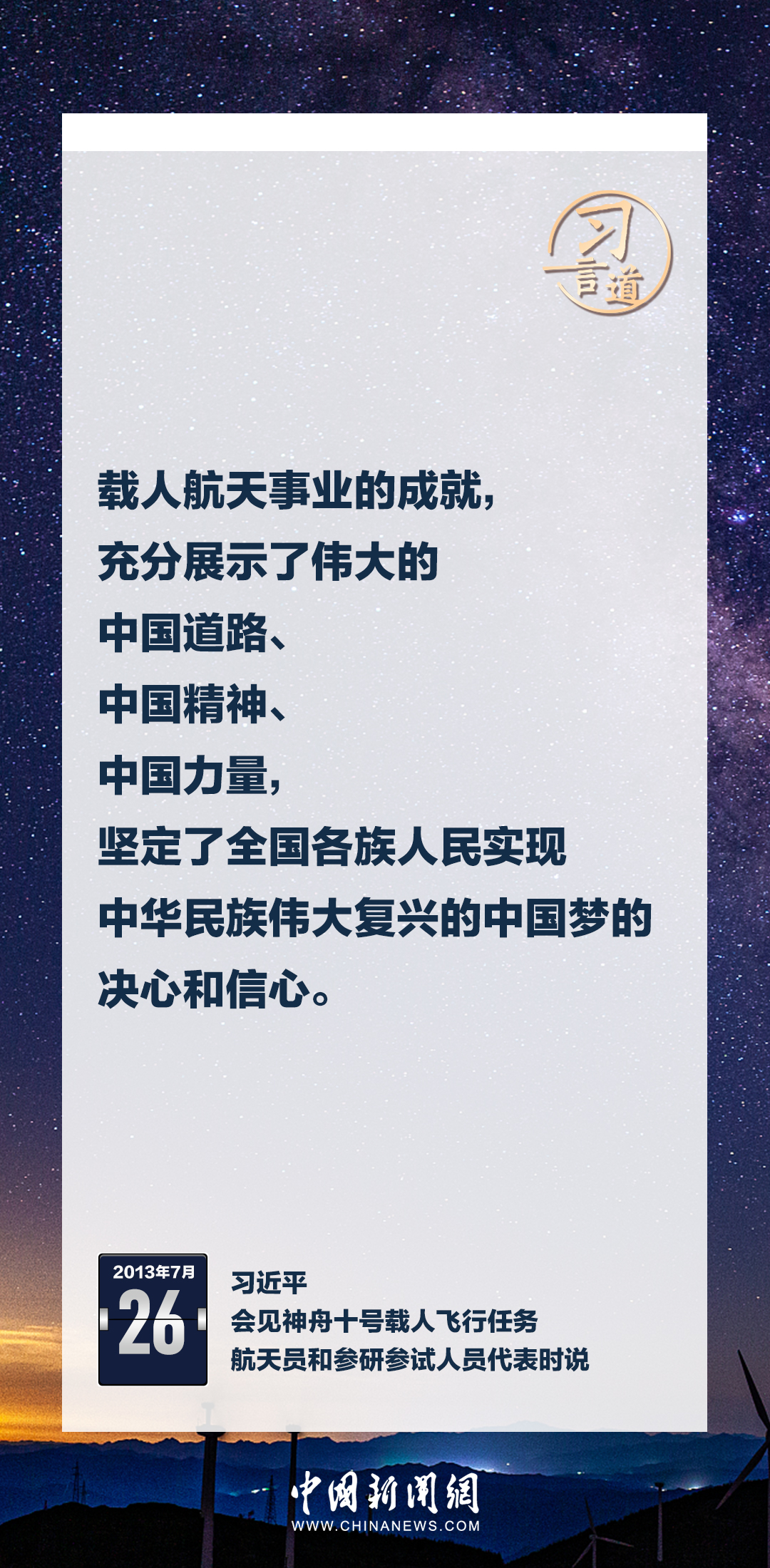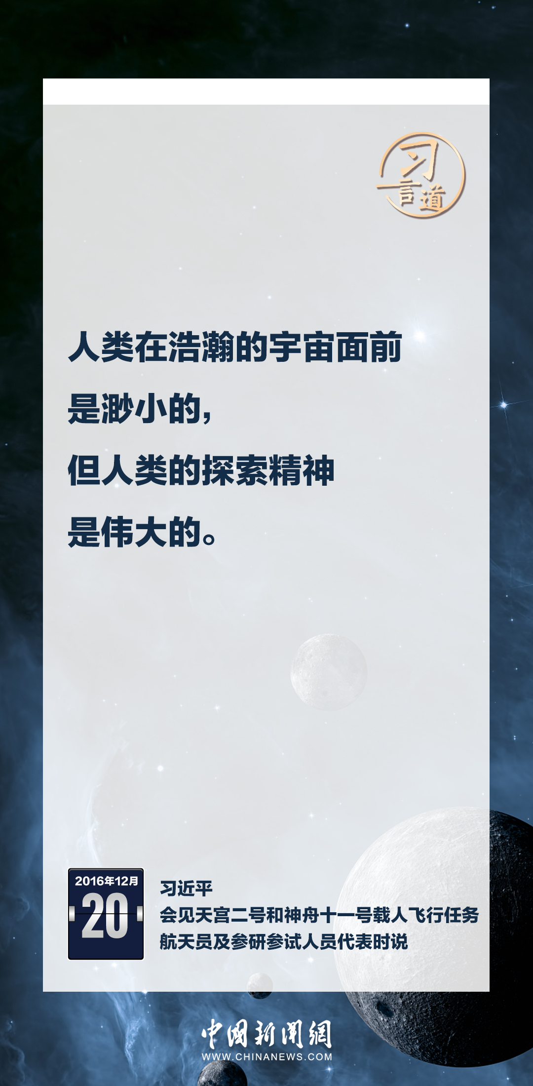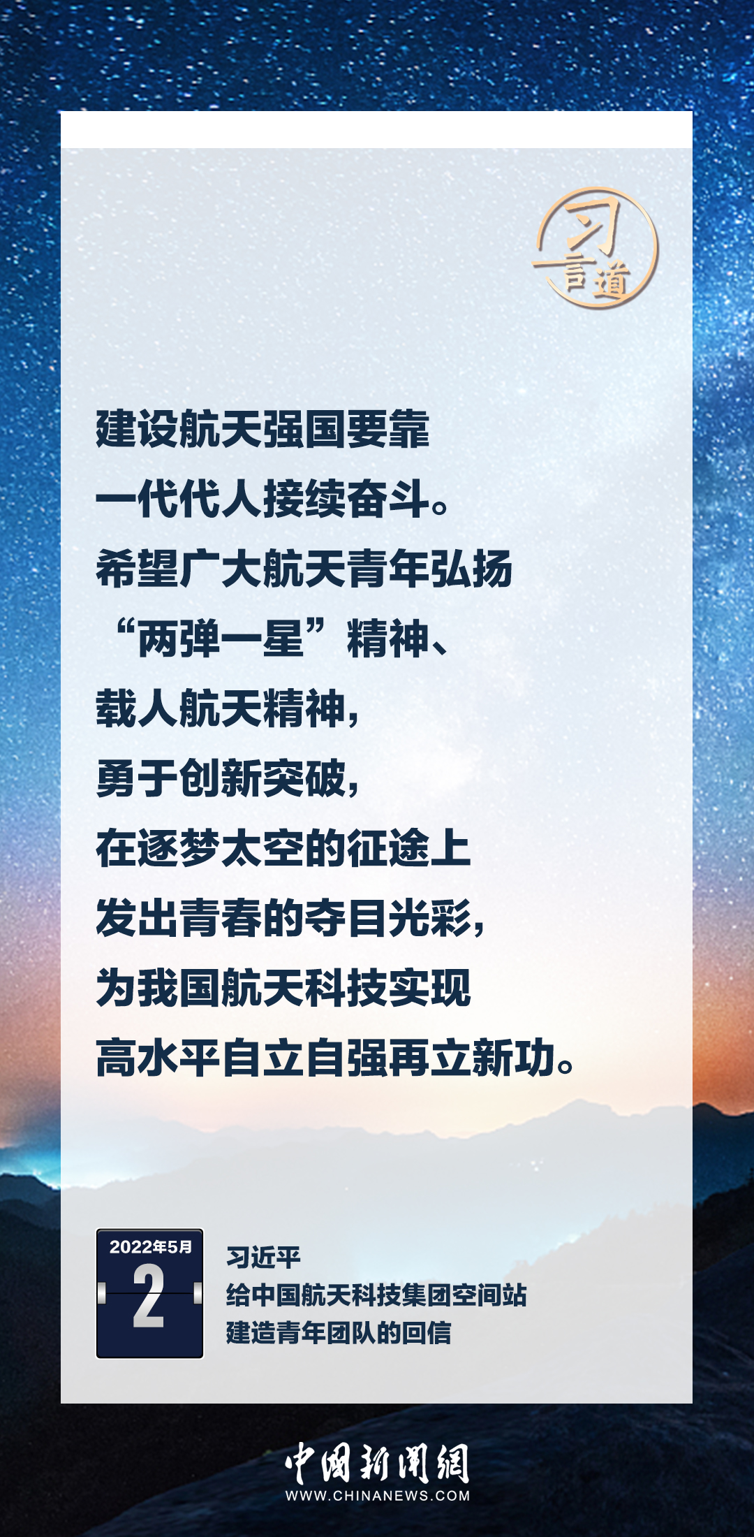 建設(shè)航天強(qiáng)國(guó)要靠一代代人接續(xù)奮斗。在不同場(chǎng)合,習(xí)近平總書(shū)記頻頻提及航天精神,激勵(lì)一代代中國(guó)人不斷奮進(jìn)、筑夢(mèng)太空。