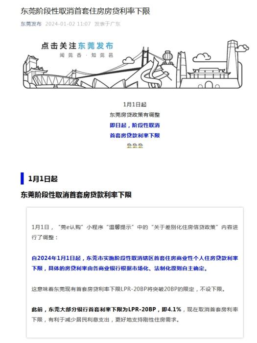 中新網(wǎng)1月2日電 據(jù)“東莞發(fā)布”微信公眾號消息,自2024年1月1日起,廣東省東莞市實施階段性取消轄區(qū)首套住房商業(yè)性個人住房貸款利率下限,具體的房貸利率由各商業(yè)銀行根據(jù)市場化、法制化原則自主確定。這意味著東莞現(xiàn)有首套房貸利率下限LPR-20BP將突破20BP的限定,不設下限。