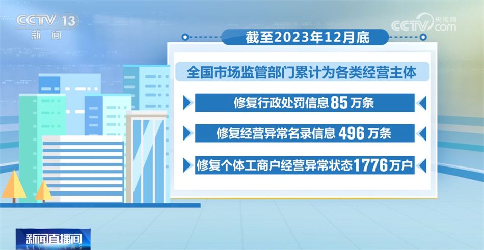 截至2023年12月底,全國市場監(jiān)管部門累計(jì)為各類經(jīng)營主體修復(fù)行政處罰信息85萬條,修復(fù)經(jīng)營異常名錄信息496萬條,修復(fù)個(gè)體工商戶經(jīng)營異常狀態(tài)1776萬戶。