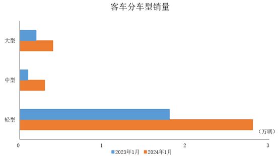 2024年1月,客車產銷均完成3.5萬輛,環(huán)比分別下降35.3%和36.5%,同比分別增長68.1%和63.4%。在客車細分品種中,與上月相比,三大類客車品種產銷均呈兩位數(shù)下降;與上年同期相比,三大類客車品種產銷均呈不同程度增長。