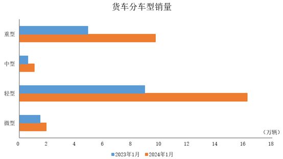 2024年1月,貨車產銷分別完成29.2萬輛和28.9萬輛,環(huán)比分別下降6.4%和6.6%,同比分別增長65.9%和81.8%。在貨車細分品種中,與上月相比,重型貨車和中型貨車產銷明顯增長,輕型貨車和微型貨車產銷呈兩位數(shù)下降;與上年同期相比,四大類貨車品種產銷均呈不同程度增長。