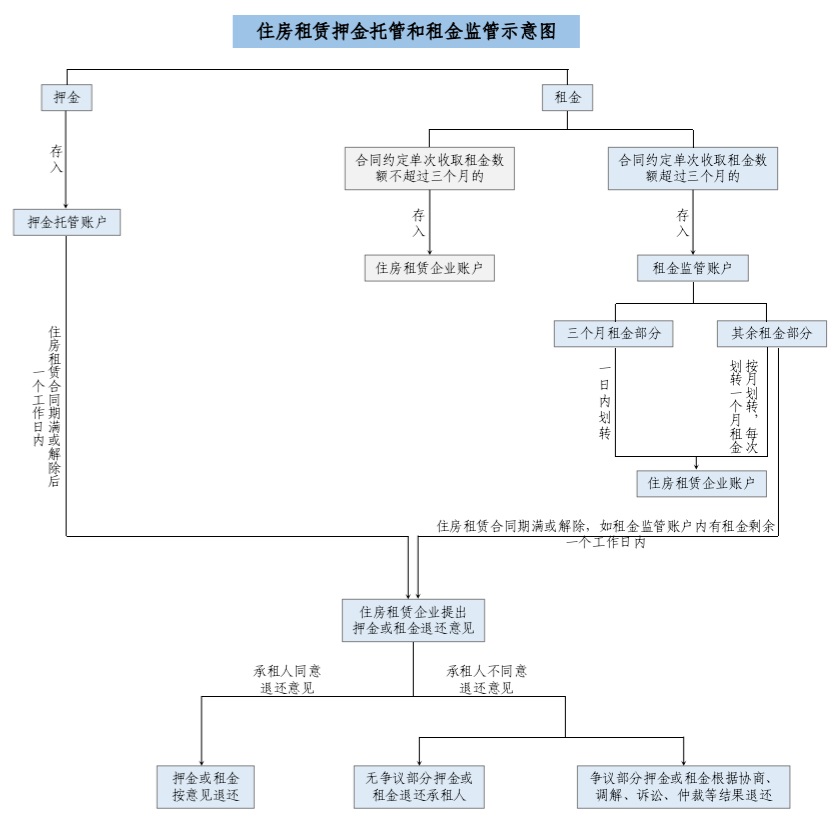 《北京市住房租賃條例》第三十六條規(guī)定,住房租賃企業(yè)向承租人收取的押金應(yīng)通過第三方專用賬戶托管,單次收取租金的數(shù)額超過三個月租金的,超收的租金應(yīng)當(dāng)納入監(jiān)管,并且明確住房租賃企業(yè)收取的押金由第三方專用賬戶托管?!墩髑笠庖姼濉穱?yán)格落實《北京市住房租賃條例》規(guī)定,進一步制定相關(guān)實施細則,明確賬戶主體,規(guī)范押金托管、租金監(jiān)管業(yè)務(wù)流程。