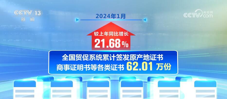 2024年1月,全國(guó)貿(mào)促系統(tǒng)累計(jì)簽發(fā)原產(chǎn)地證書、商事證明書等各類證書62.01萬份,較上年同比增長(zhǎng)21.68%。其中,全國(guó)貿(mào)促系統(tǒng)非優(yōu)惠原產(chǎn)地證書簽證金額為325.48億美元,同比增長(zhǎng)9.12%;簽證份數(shù)38.24萬份,同比增長(zhǎng)14.36%。