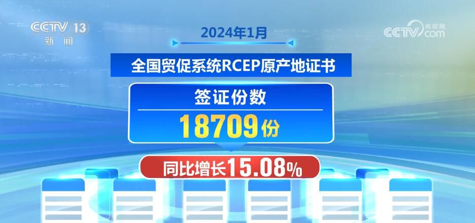 2024年1月,全國(guó)貿(mào)促系統(tǒng)RCEP原產(chǎn)地證書簽證份數(shù)為18709份,同比增長(zhǎng)15.08%;辦證企業(yè)3640家,同比增長(zhǎng)10.40%,出口目的國(guó)包括日本、印尼、韓國(guó)、越南等13個(gè)成員國(guó),預(yù)計(jì)共為我國(guó)產(chǎn)品在RCEP進(jìn)口成員國(guó)減免關(guān)稅0.09億美元,RCEP的政策紅利在持續(xù)釋放。