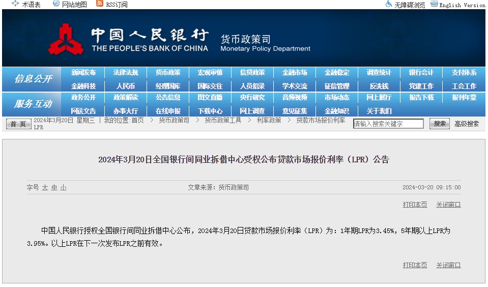 2024年3月貸款市場(chǎng)報(bào)價(jià)利率(LPR)保持不變