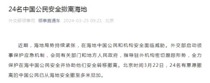 中新網(wǎng)3月25日電 據(jù)外交部領(lǐng)事司微信公眾號(hào)“領(lǐng)事直通車”25日消息,近期,海地局勢(shì)持續(xù)緊張,在海地中國(guó)公民和機(jī)構(gòu)安全面臨威脅。外交部啟動(dòng)領(lǐng)事保護(hù)應(yīng)急機(jī)制,會(huì)同有關(guān)部門(mén)和地方人民政府,指導(dǎo)駐外機(jī)構(gòu)密切跟蹤形勢(shì),全力保護(hù)在海中國(guó)公民安全并協(xié)助他們安全轉(zhuǎn)移撤離。北京時(shí)間3月22日,24名有意愿撤離的中國(guó)公民已從海地安全撤至多米尼加。