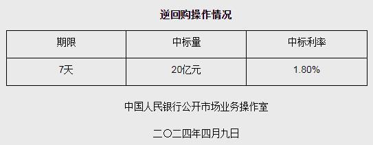 4月9日央行開(kāi)展20億元7天期逆回購(gòu)操作
