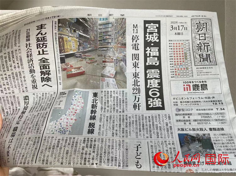 3月17日,日本《朝日新聞》在頭版頭條大篇幅刊登了地震報(bào)道。人民網(wǎng) 吳穎攝