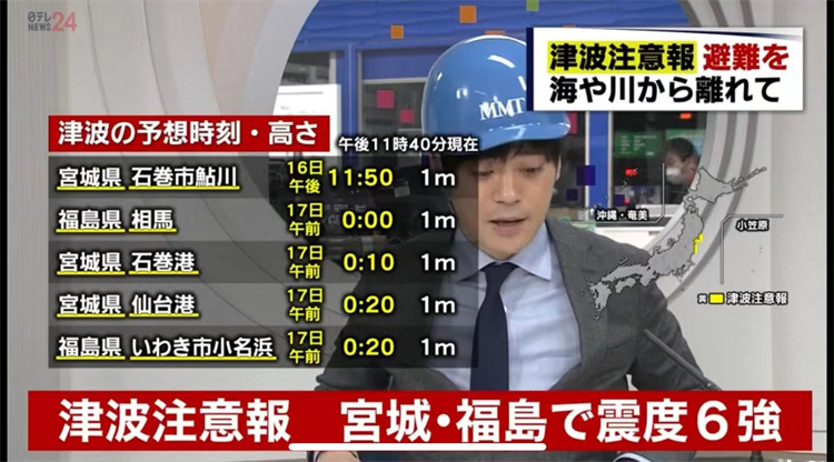 3月16日日本福島縣海域發(fā)生7.4級地震,當(dāng)?shù)匕l(fā)出海嘯警報(bào)。圖片來源:日本新聞報(bào)道截圖