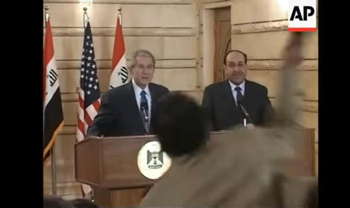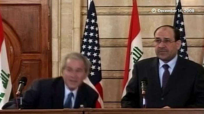 2008年12月,時(shí)任美國總統(tǒng)小布什在伊拉克首都巴格達(dá)的新聞發(fā)布會(huì)上,被伊拉克記者蒙塔達(dá)爾·扎伊迪扔鞋。圖片來源:美聯(lián)社視頻截圖