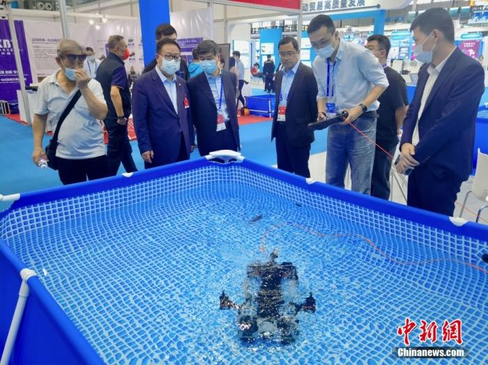 資料圖:2022年11月16日,在深圳舉行的第二十四屆中國國際高新技術(shù)成果交易會上,參展商攜“黑科技”產(chǎn)品亮相高交會。圖為深圳企業(yè)研制的潛鮫P200 PRO行業(yè)級水下機(jī)器人。 中新社記者 陳文 攝