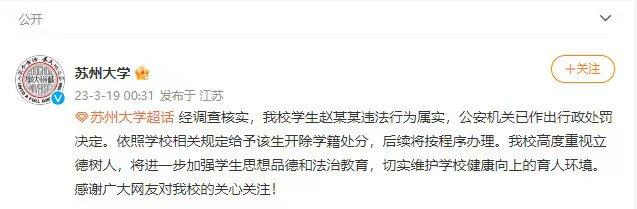 3月19日,蘇州大學(xué)發(fā)布通報(bào):經(jīng)調(diào)查核實(shí),我校學(xué)生趙某某違法行為屬實(shí),公安機(jī)關(guān)已作出行政處罰決定。依照學(xué)校相關(guān)規(guī)定給予該生開除學(xué)籍處分,后續(xù)將按程序辦理。我校高度重視立德樹人,將進(jìn)一步加強(qiáng)學(xué)生思想品德和法治教育,切實(shí)維護(hù)學(xué)校健康向上的育人環(huán)境。感謝廣大網(wǎng)友對(duì)我校的關(guān)心關(guān)注!