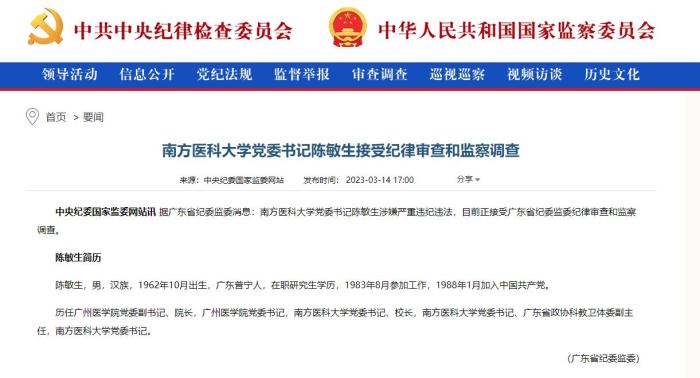 3月14日,中央紀(jì)委國家監(jiān)委發(fā)布兩則涉及醫(yī)藥衛(wèi)生領(lǐng)域干部被查的消息,落馬官員分別為南方醫(yī)科大學(xué)黨委書記陳敏生,廣西壯族自治區(qū)醫(yī)療保障局原黨組書記、局長王忠平。