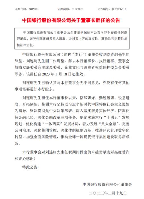 另外,19日,中國銀行公告稱,劉連舸因工作調(diào)整,辭去董事長、執(zhí)行董事、董事會戰(zhàn)略發(fā)展委員會主席及委員、企業(yè)文化與消費者權(quán)益保護(hù)委員會委員職務(wù)。