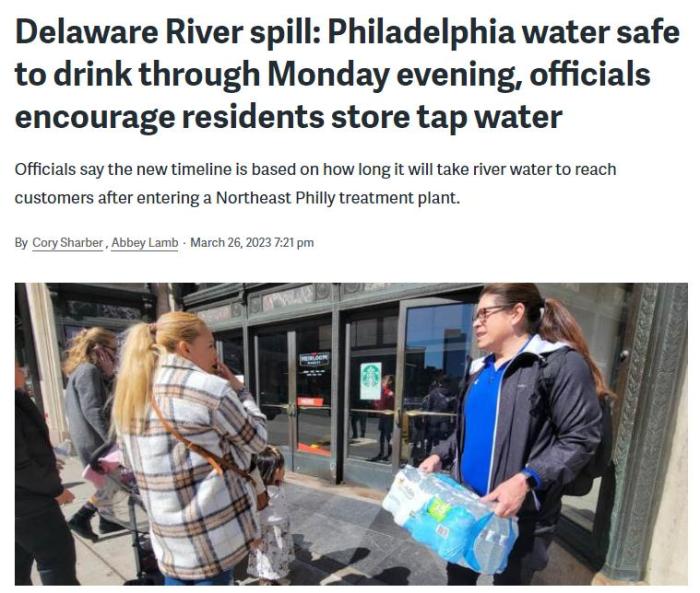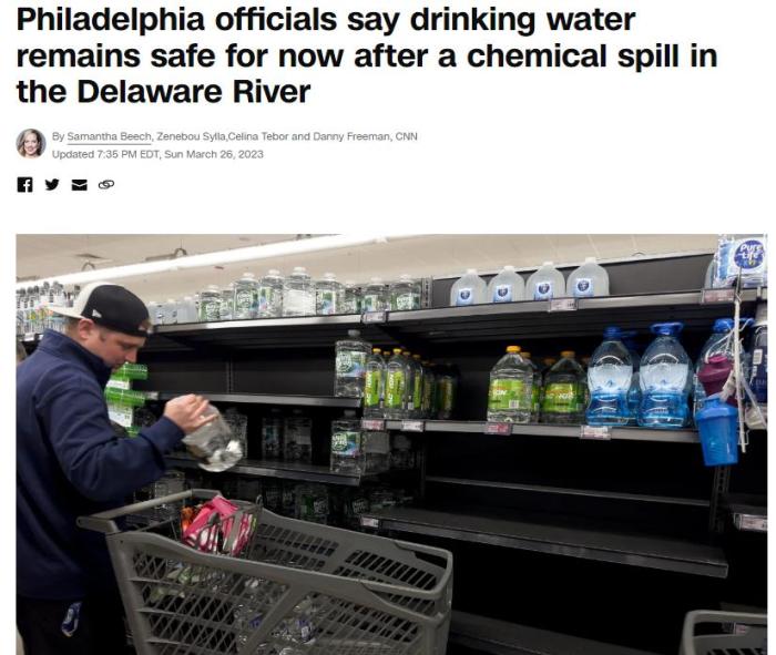 中新網(wǎng)3月27日電 綜合外媒報(bào)道,近日,美國(guó)賓州布里斯托爾一家工廠發(fā)生泄漏事故,大量化學(xué)物質(zhì)流入特拉華河一條支流中。事故發(fā)生后,費(fèi)城官員建議當(dāng)?shù)孛癖娛褂闷垦b水,引發(fā)恐慌性購(gòu)買(mǎi)。
