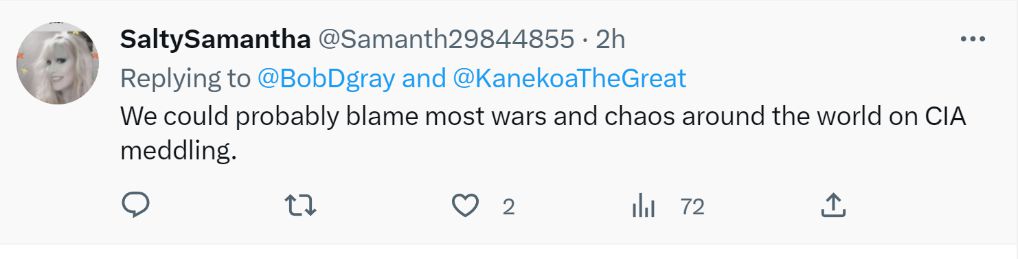 網(wǎng)友“有趣的薩曼莎”說(shuō):“世界上絕大多數(shù)的戰(zhàn)爭(zhēng)和混亂都是美國(guó)中央情報(bào)局帶來(lái)的吧?!?/p>