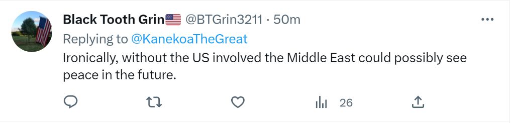 一名自我介紹是美國(guó)退役軍人的網(wǎng)友“現(xiàn)身說(shuō)法”:“真諷刺,沒(méi)有美國(guó)摻和,中東或許未來(lái)就會(huì)實(shí)現(xiàn)和平。