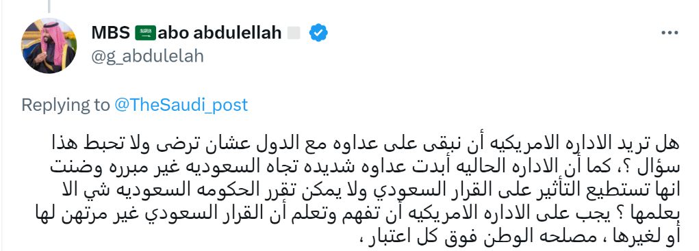 沙特網(wǎng)友阿博·阿卜杜勒拉言辭激烈地批評(píng):“只有我們與其他國(guó)家保持?jǐn)骋饷绹?guó)才不會(huì)失望嗎?美國(guó)政府對(duì)沙特表現(xiàn)出強(qiáng)烈而無(wú)理的敵意,居然還認(rèn)為它可以影響沙特的決定、沙特只能在它的指導(dǎo)下做事?美國(guó)政府必須了解,沙特的決定不依附于任何其他人。祖國(guó)的利益高于一切。