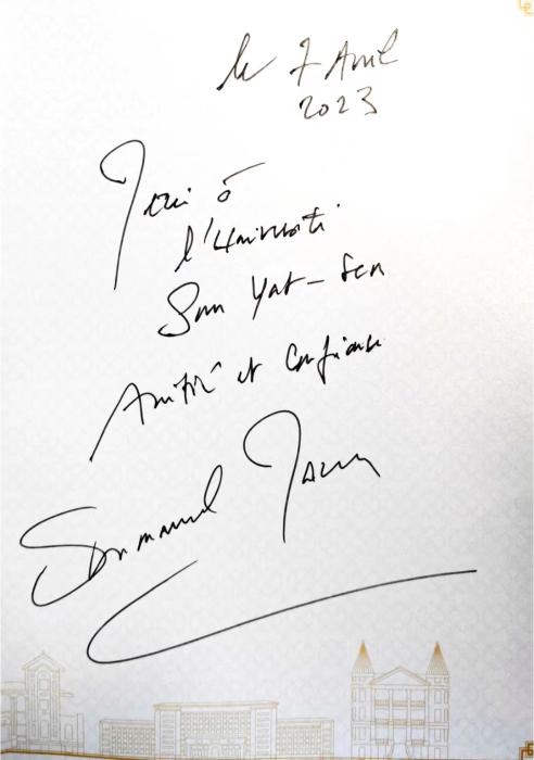臨別之時,馬克龍留下感言,為中山大學(xué)題字:“感謝中山大學(xué)的友誼與信任。埃馬紐埃爾·馬克龍,2023年4月7日?!?/p>