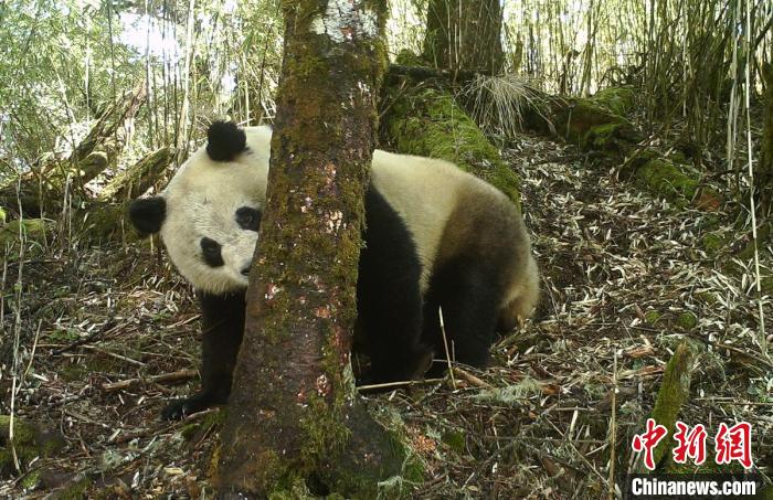 野生大熊貓“磨皮擦癢”?!〈笮茇垏?guó)家公園石棉片區(qū) 供圖