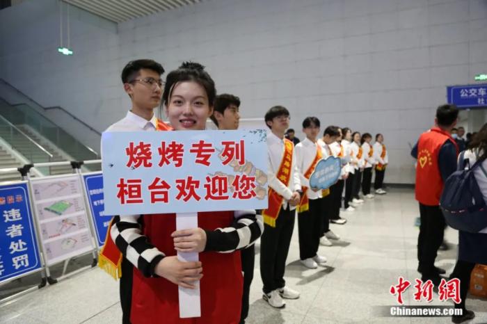淄博志愿者在車站歡迎燒烤專列旅客。梁兆福 攝
