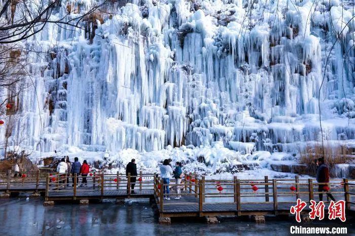 資料圖:游客在淄博潭溪山景區(qū)感受冰瀑魅力。崔新程 攝