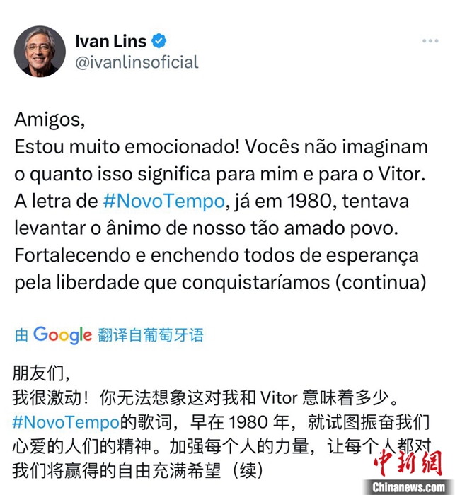 巴西名曲《Novo Tempo》在中巴元首會(huì)面時(shí)奏響,歌曲作曲、歌者伊萬·林斯在社交媒體上留言。截圖