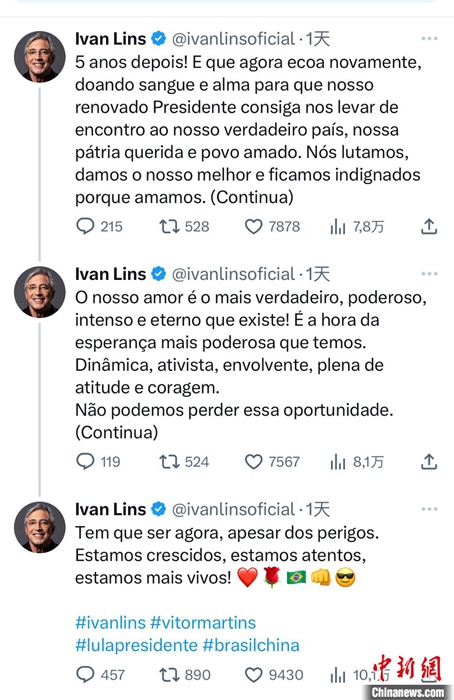巴西音樂家伊萬·林斯在社交媒體連發(fā)多條留言,引發(fā)網(wǎng)絡(luò)熱潮。截圖