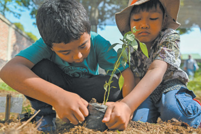 在印度尼西亞班達亞齊的一所自然小學里,學生們正在種植樹苗。