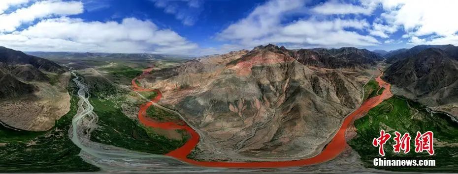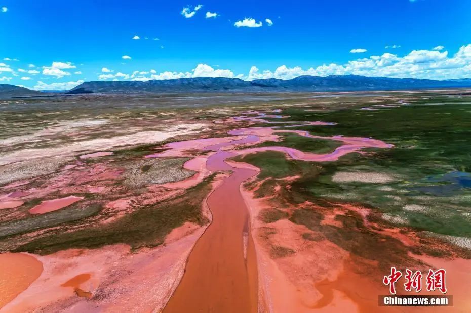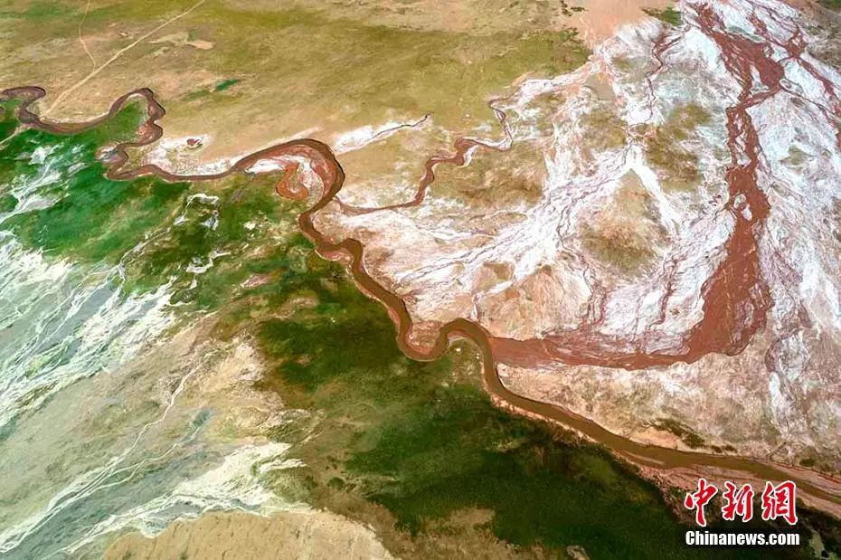 阿拉克湖多條支流奔流不息地拍打著紅色河床,猶如碧玉寶鏡舞動著紅色絲帶。柴迪成 攝