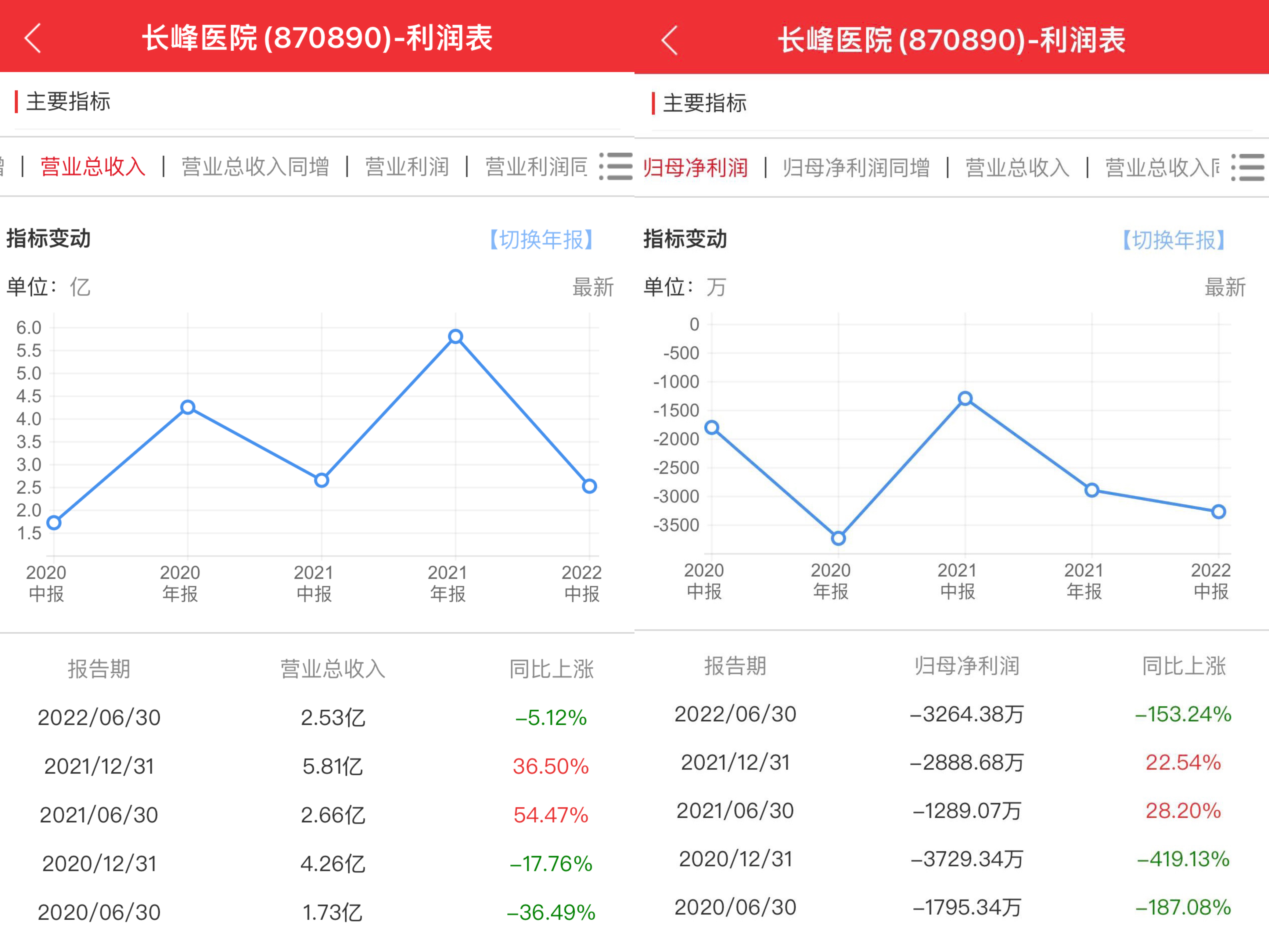 進(jìn)入2022年上半年,長峰醫(yī)院的虧損也在持續(xù)擴(kuò)大,公司營收和歸母凈利潤分別為2.53億元、-3264.38萬元,分別同比減少5.12%、153.23%;毛利率20.67%,較上年同期下降 29.82%。